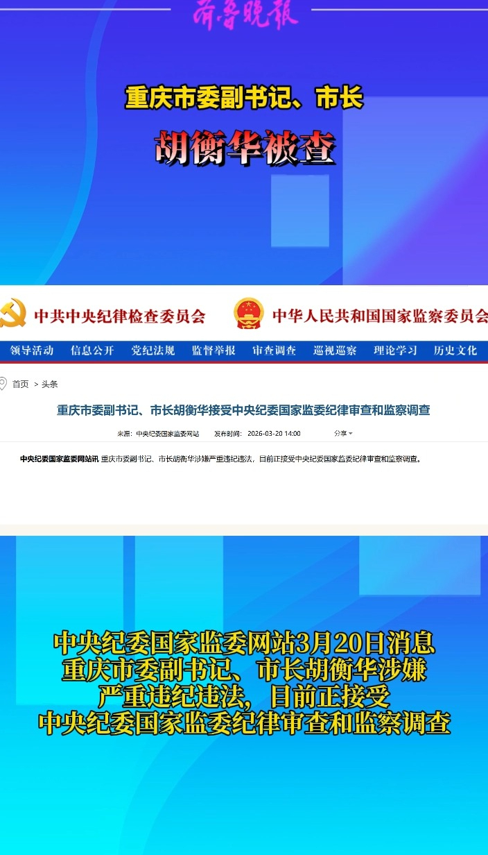 观政视频|重庆市委副书记、市长胡衡华被查齐鲁壹点 | 59分钟前 原创齐鲁晚报·齐鲁壹点客户端 微信扫码扫码下载客户端中央纪委国家监委网站3月20日消息,重庆市委副书记、市长胡衡华涉嫌严重违纪违法,目前正接受中央纪委国家监委纪律审查和监察调查。