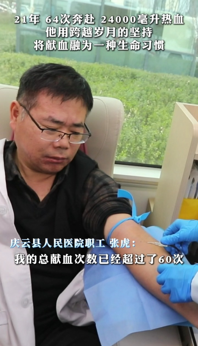 21年坚守,64次奔赴,24000毫升热血,他将献血融为一种生命习惯大众新闻 18:51原创21年坚守,64次奔赴,24000毫升热血,将献血融为一种生命习惯。庆云县人民医院职工张虎,以热血守护生命,用行动传递温暖。不久前,张虎荣获了全国“无偿献血奉献奖金奖”及“终身荣誉奖”。张虎自己说:“我自己就在医院工作,我更知道生命的宝贵,能用可再生的血液去拯救一条不可重来的生命,我觉得非常有意义。”(大众新闻记者 贺莹莹 通讯员 刘伟增 高强)
