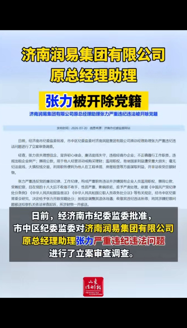 济南润易集团有限公司原总经理助理张力被开除党籍