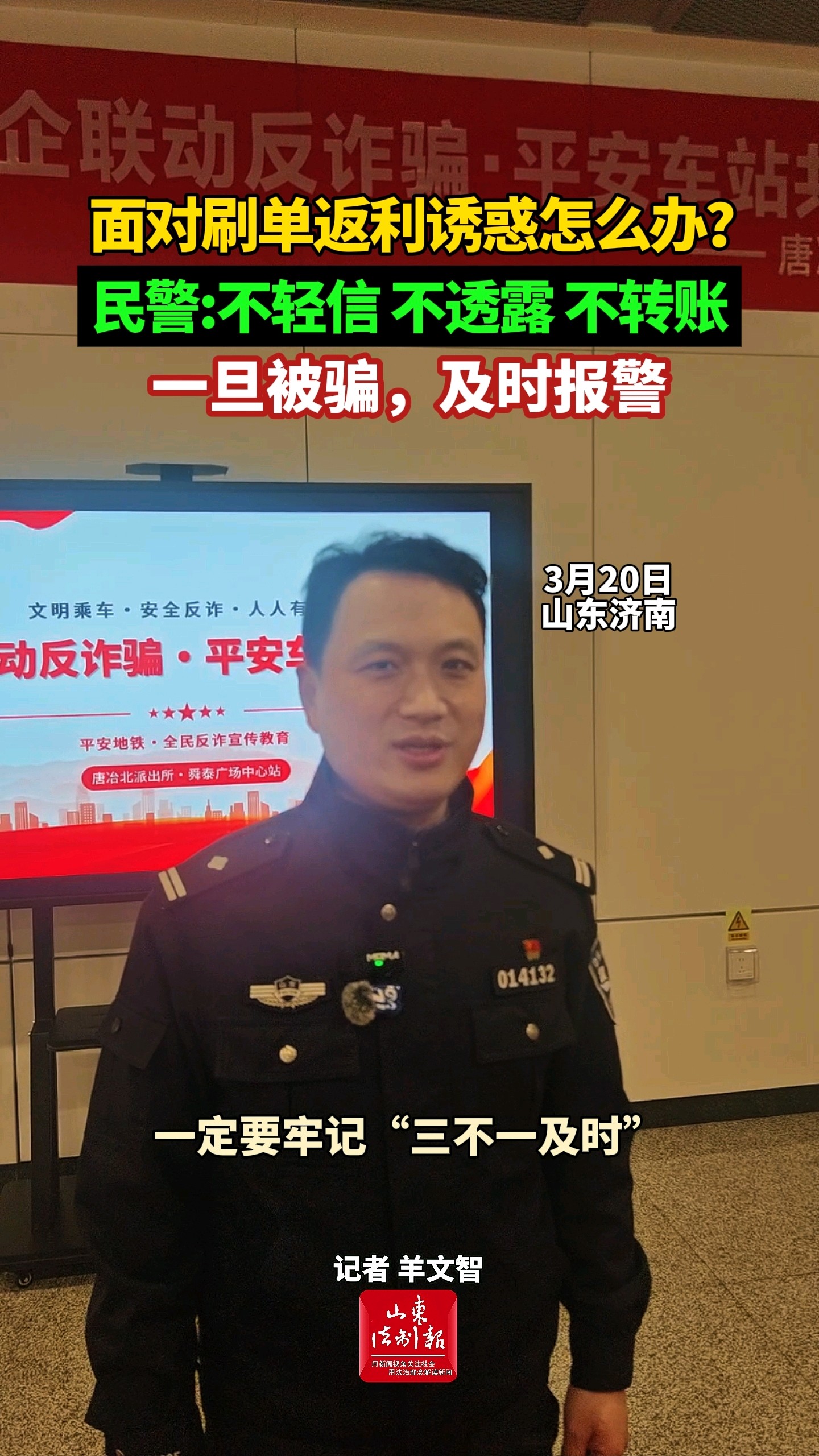 面对刷单返利诱惑怎么办?民警:不轻信、不透露、不转账,一旦被骗,及时报警山东法制报 | 14:16 现场山东法制报 微信扫码扫码下载客户端3月20日,济南市公安局轨道公交分局唐冶北派出所联合济南轨道集团运营一公司,共同开展“警企联动反诈骗 平安车站共创建”活动。济南市公安局轨道公交分局侦查大队队长路洪涛现场讲解刷单诈骗案例,提醒广大市民乘客牢记“三不一及时”:不轻信、不透露、不转账,及时报警。(大众新闻·山东法制报记者 羊文智)