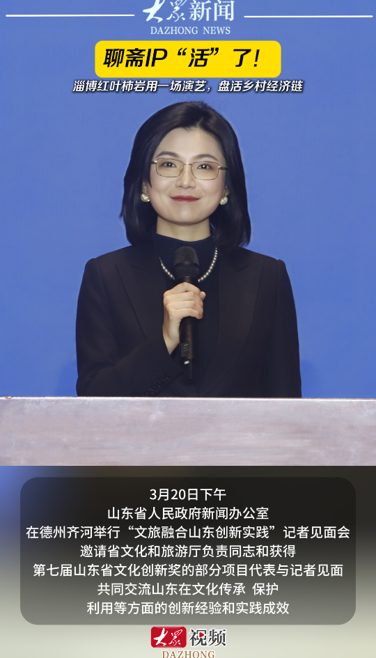 聊斋IP“活”了!淄博红叶柿岩用一场演艺,盘活乡村经济链大众新闻 21:57原创3月20日下午,山东省人民政府新闻办公室在德州齐河举行“文旅融合山东创新实践”记者见面会,邀请省文化和旅游厅负责同志和获得第七届山东省文化创新奖的部分项目代表与记者见面,共同交流山东在文化传承、保护利用等方面的创新经验和实践成效。(大众新闻记者 高广超 程文琪 策划 马玉峰 王雅洁)