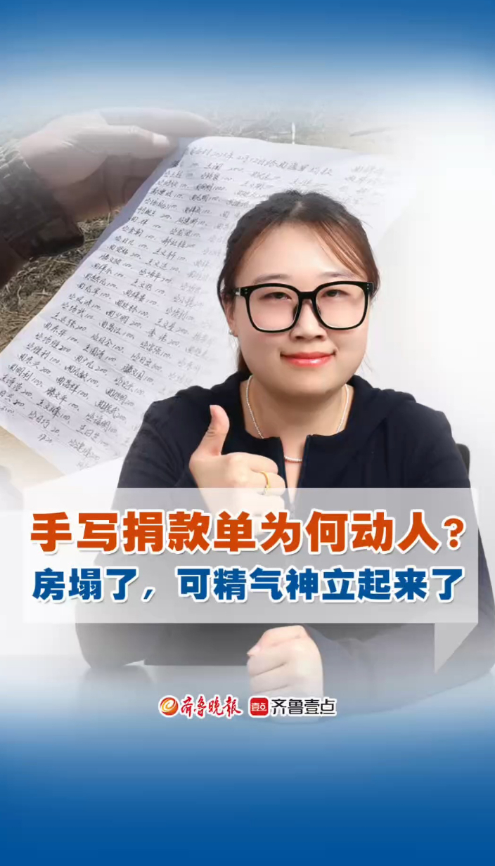果然视频|手写捐款单为何动人?房塌了,可精气神立起来了齐鲁晚报·齐鲁壹点客户端 21:56原创近日,一份字迹工整的捐款单受到广大网友关注。烟台市牟平区高陵镇范家庄村的一户村民家中不幸失火,村党支部书记牵头倡议,乡亲们踊跃捐款,手写捐款单上的122个名字,承载着浓浓的乡邻深情。大火烧塌了房屋,可守望相助的精气神立起来了。比重建房屋更重要的,是深植于乡土、凝聚人心的精神力量。 (齐鲁晚报·齐鲁壹点 张琪 王琳 钟建军)