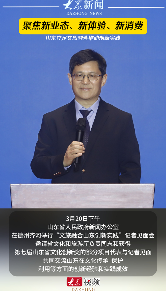 聚焦新业态、新体验、新消费,山东立足文旅融合推动创新实践大众新闻 21:56原创3月20日下午,山东省人民政府新闻办公室在德州齐河举行“文旅融合山东创新实践”记者见面会,邀请省文化和旅游厅负责同志和获得第七届山东省文化创新奖的部分项目代表与记者见面,共同交流山东在文化传承、保护利用等方面的创新经验和实践成效。(大众新闻记者 高广超 程文琪 策划 马玉峰 王雅洁)