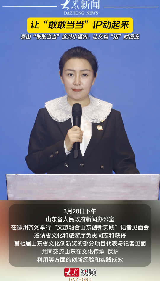 泰山“敢敢当当”这对小福将,让文物“活”成顶流大众新闻 21:57原创3月20日下午,山东省人民政府新闻办公室在德州齐河举行“文旅融合山东创新实践”记者见面会,邀请省文化和旅游厅负责同志和获得第七届山东省文化创新奖的部分项目代表与记者见面,共同交流山东在文化传承、保护利用等方面的创新经验和实践成效。(大众新闻记者 高广超 程文琪 策划 马玉峰 王雅洁)