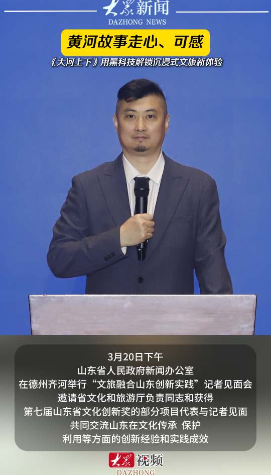 黄河故事走心、可感,《大河上下》用黑科技解锁沉浸式文旅新体验大众新闻 昨天22:30原创3月20日下午,山东省人民政府新闻办公室在德州齐河举行“文旅融合山东创新实践”记者见面会,邀请省文化和旅游厅负责同志和获得第七届山东省文化创新奖的部分项目代表与记者见面,共同交流山东在文化传承、保护利用等方面的创新经验和实践成效。(大众新闻记者 高广超 程文琪 策划 马玉峰 王雅洁)