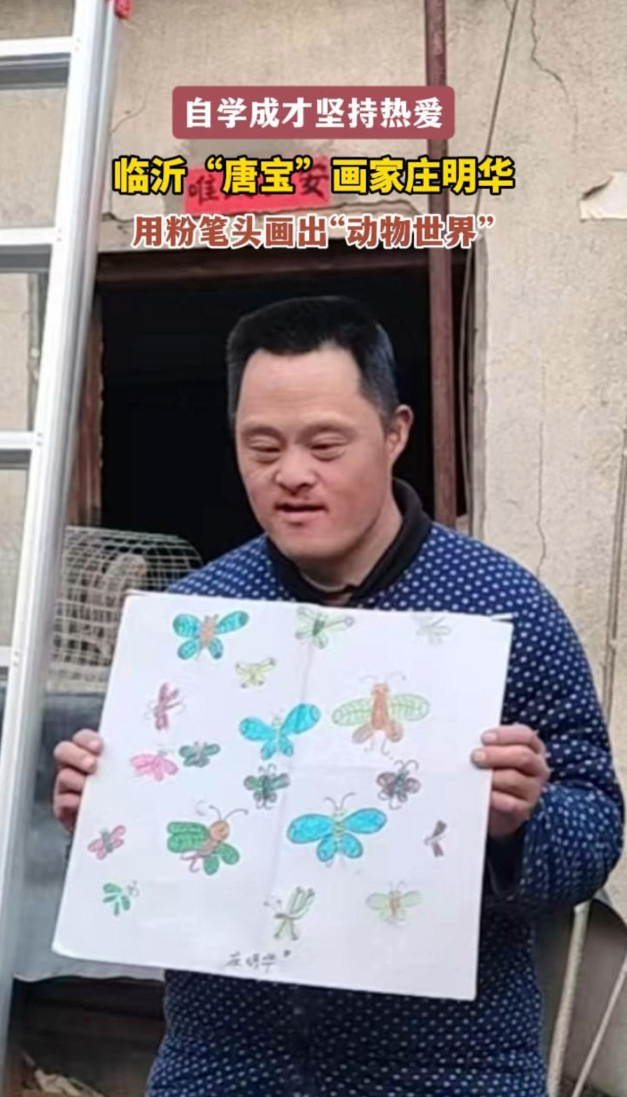 果然视频|临沂“唐宝”庄明华用粉笔头画出精彩世界大众报业·齐鲁壹点 19:18在山东省临沂市沂南县蒲汪镇大王庄村一个普通的农家院落里,47岁的庄明华蹲在地上,拿着粉笔,专注地在地上画着一头小猪。17秒后,一头栩栩如生、憨态可掬的小猪跃然“地”上。这个速度,甚至比很多专业画家还要快。庄明华是一名唐氏综合征患者,被网友们亲切地称为“唐宝”。一支粉笔,在他手中就是精彩世界。