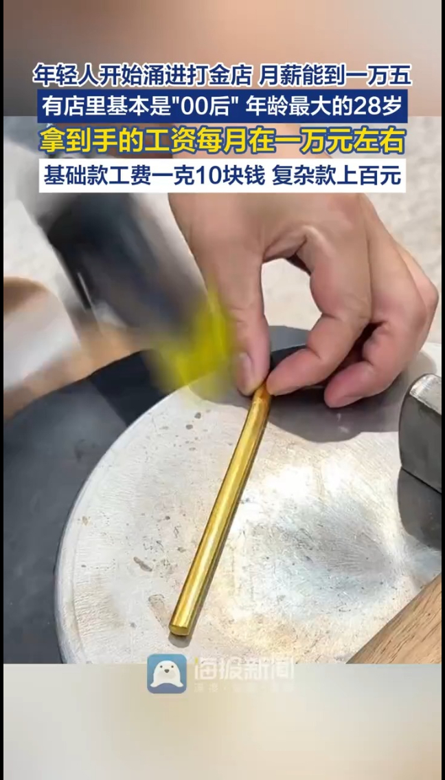 不少消费者说,把老式金饰拿来"焕新",既保留了黄金的价值和情感记忆,又符合潮流,成了兼具审美、情感和金融功能的"新国潮"。打金火起来,也带火了一批年轻打金师。有店主告诉记者,店里10名打金师基本都是00后,最大的才28岁。技术好的錾刻师,月薪能到一万五。