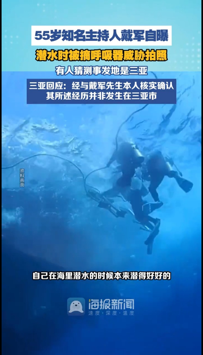 主持人戴军自曝潜水时被摘呼吸器威胁拍照,三亚回应:其所述经历并非发生在三亚市。近日,知名主持人戴军自曝自己在潜水时曾遭当地旅游人员威胁。戴军说,自己在海里潜水的时候本来潜得好好的,结果当地做旅游的人过来把呼吸器拔掉,问要不要拍照:“工作人员拔掉时说,要拍照嘛?我要拍照要拍照,赶紧把那个呼吸器给我。”他直言该行为特别吓人。有不少网友猜测,事发地是三亚。3月20日,三亚市旅游品质保障协会发布辟谣声明:对此,我协会高度重视,第一时间开展核查。经与戴军先生本人核实确认,其所述经历并非发生在三亚市。