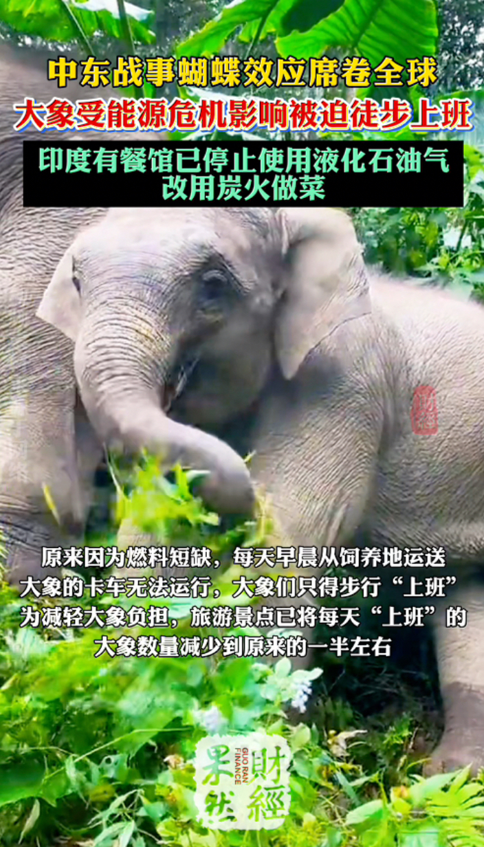 果然财经|中东战事蝴蝶效应席卷全球,泰国有大象被迫徒步上班 13:19 原创齐鲁晚报·齐鲁壹点客户端 微信扫码扫码下载客户端据央视网,随着中东战事持续,影响持续外溢,“高油价冲击波”正传导至交通运输、食品等方方面面。有分析人士指出,中东战事的蝴蝶效应正在全球范围内持续放大。在泰国,当地民众、外国游客乃至旅游景点的大象都切身感受到了压力。