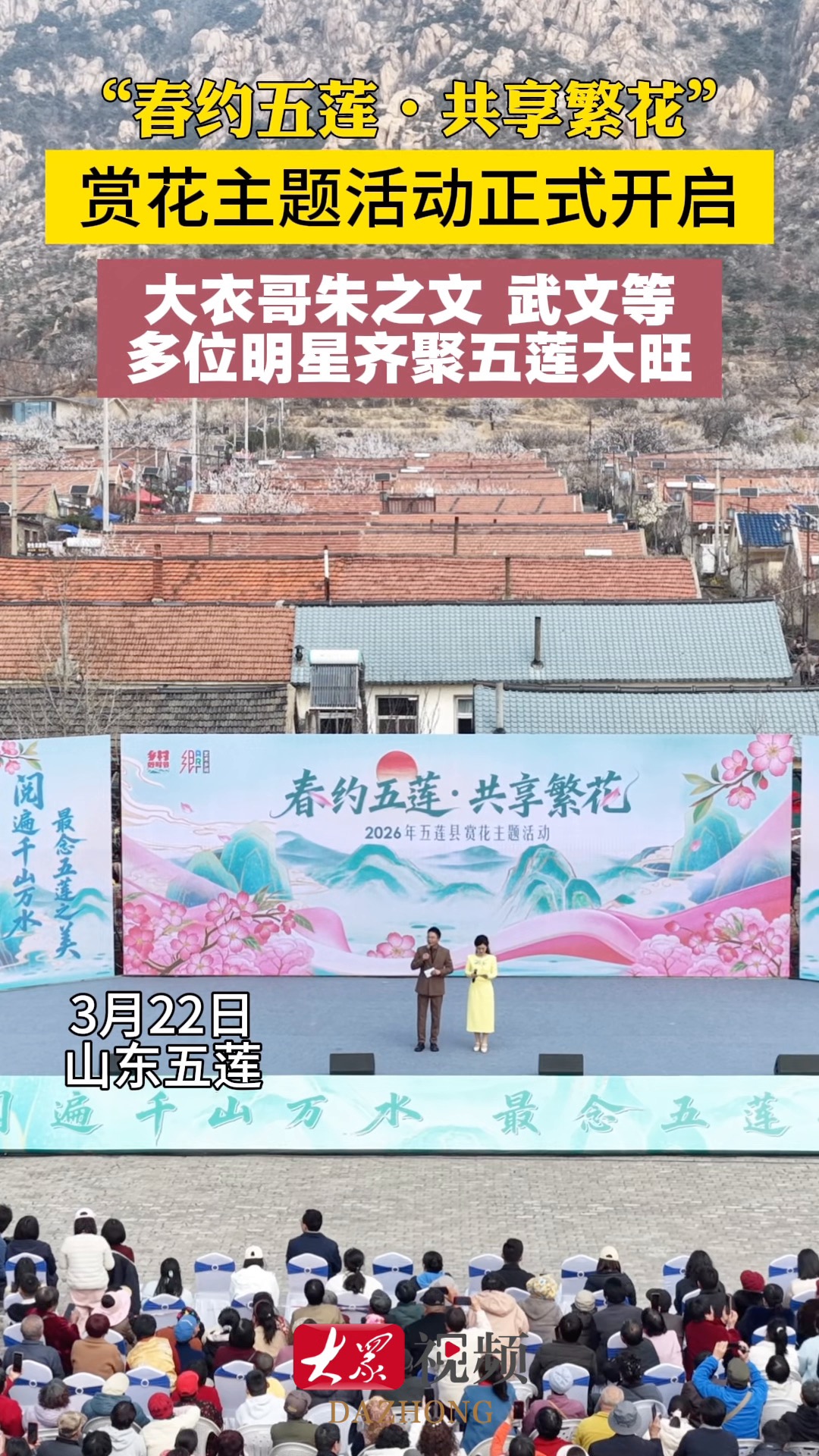 “大衣哥”、武文等现身大旺村!邀你“春约五莲 共享繁花”大众新闻客户端 16:06原创3月22日,2026年日照市“花漾日照”春季游主题产品发布暨“春约五莲·共享繁花”赏花主题活动在五莲县叩官镇大旺村盛大启幕。“大衣哥”朱之文、武文等现场助阵。(大众新闻记者 栗晟皓 通讯员 张宁 实习生 秦丽丽 郭知文)