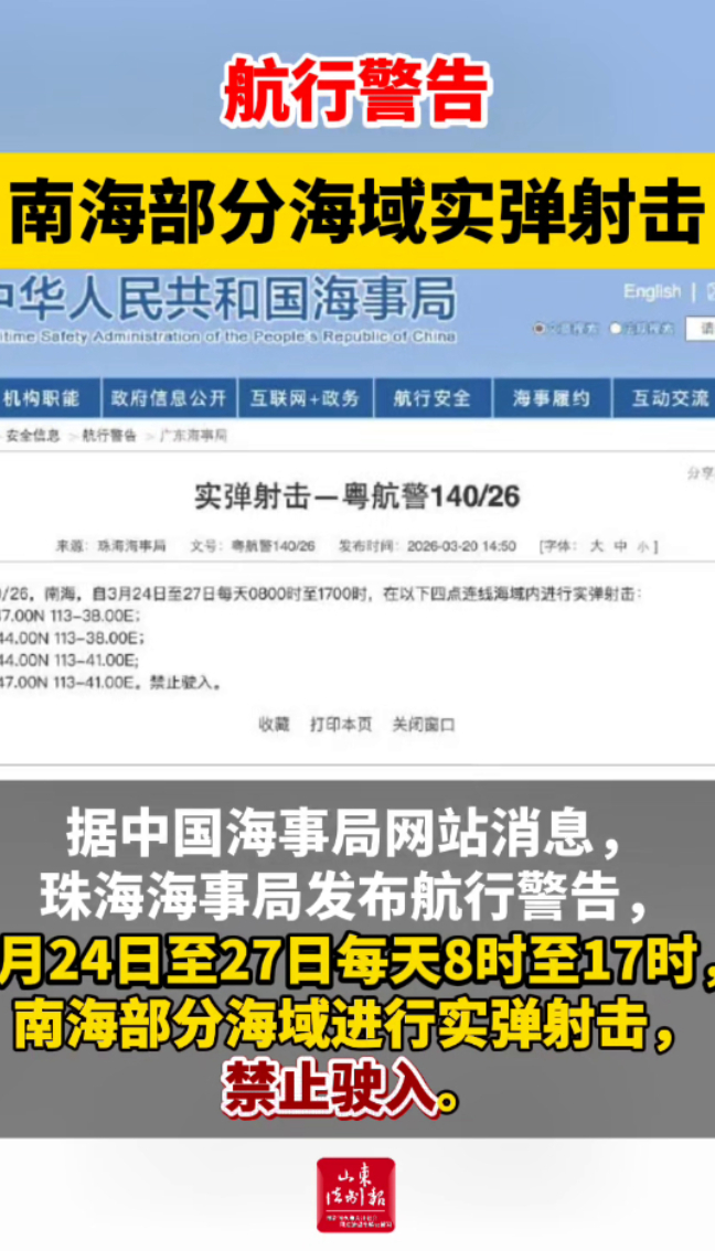 航行警告!南海部分海域实弹射击山东法制报 | 10:15 大众新闻·山东法制报 微信扫码扫码下载客户端据中国海事局网站消息,珠海海事局发布航行警告,3月24日至27日每天8时至17时,南海部分海域进行实弹射击,禁止驶入。