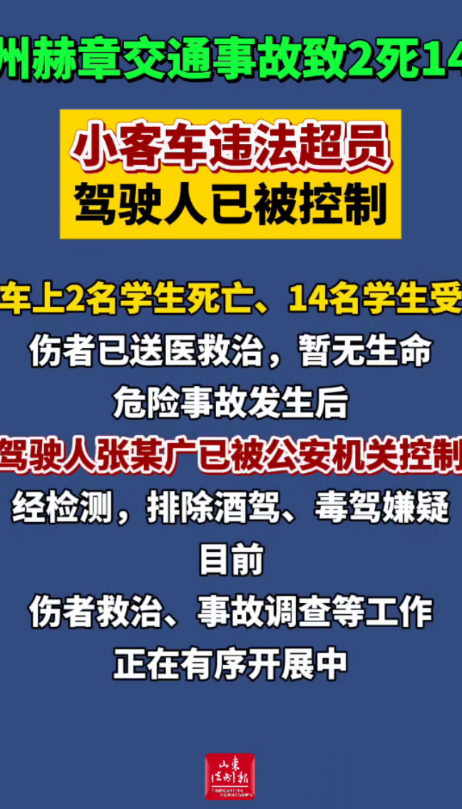 经查,驾驶人张某广(男,49岁)驾驶自有五菱小型客车违法超员,在途经河镇乡园区大道时,与一辆停放在路边的大型货车碰撞,致车上2名学生死亡、14名学生受伤,伤者已送医救治,暂无生命危险。事故发生后,驾驶人张某广已被公安机关控制,经检测,排除酒驾、毒驾嫌疑。