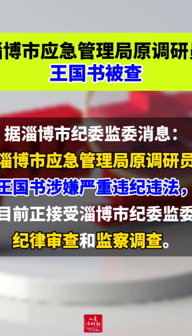淄博市应急管理局原调研员王国书被查山东法制报 | 11:52 大众新闻·山东法制报 微信扫码扫码下载客户端据淄博市纪委监委消息:淄博市应急管理局原调研员王国书涉嫌严重违纪违法,目前正接受淄博市纪委监委纪律审查和监察调查。
