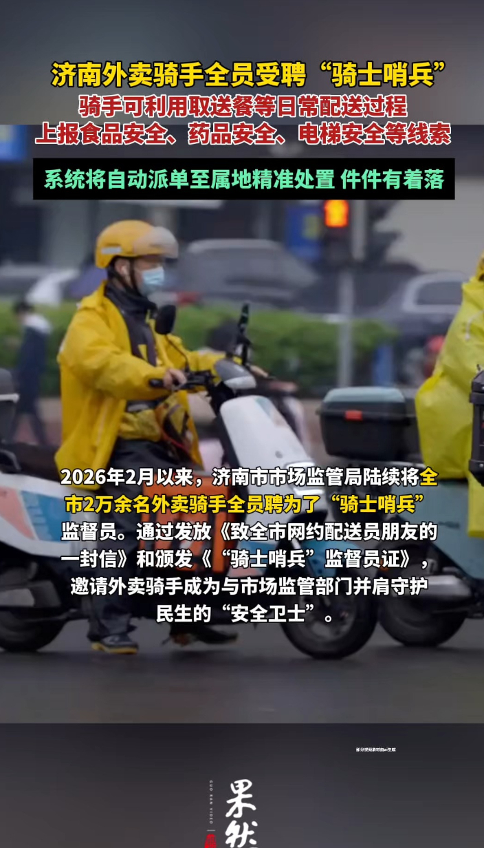 果然视频|外卖骑手全员受聘“骑士哨兵”,日常配送时可上报线索齐鲁晚报·齐鲁壹点客户端 17:02原创2026年2月以来,济南市市场监管局陆续将全市2万余名外卖骑手全员聘为了“骑士哨兵”监督员。通过发放《致全市网约配送员朋友的一封信》和颁发《“骑士哨兵”监督员证》,邀请外卖骑手成为与市场监管部门并肩守护民生的“安全卫士”——取餐时,留心店铺食品安全;取药取货时,留意药品安全与产品质量安全;配送途中,关注电梯安全与金融安全。(齐鲁晚报·齐鲁壹点 李梦瑶)