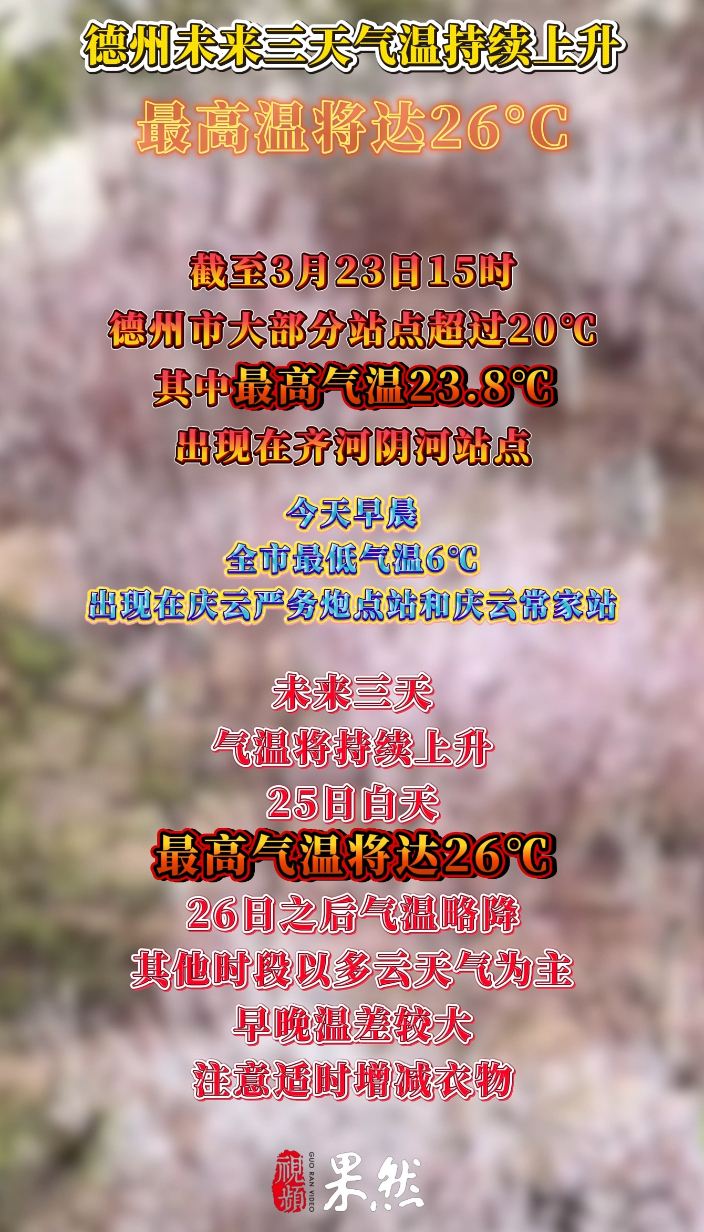 果然视频丨德州未来三天气温持续上升 最高温将达26℃齐鲁晚报·齐鲁壹点客户端 19:13原创截至3月23日15时,德州市大部分站点超过20℃,其中最高气温23.8℃出现在齐河阴河站点。未来三天,气温将持续上升,25日白天,最高气温将达26℃,26日之后气温略降,其他时段以多云天气为主。早晚温差较大,注意适时增减衣物。(齐鲁晚报·齐鲁壹点 刘超)