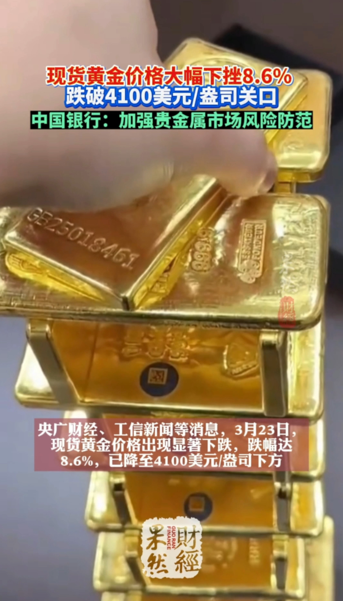 果然财经|黄金跌破4100美元,中行紧急提示风险 19:52 原创齐鲁晚报·齐鲁壹点客户端 微信扫码扫码下载客户端3 月 23 日,现货黄金大幅跳水,盘中跌破 4100 美元 / 盎司,日内大跌 8.7%,本月累计跌幅超 22%,创下阶段性新低。尽管地缘风险升温,黄金却丧失避险属性,价格持续承压。当日,中国银行发布贵金属风险提示,指出海内外贵金属波动加剧,提醒持有积存金、账户贵金属等产品的投资者,理性投资、严控仓位、拉长投资周期,防范金价剧烈波动带来的亏损风险。
