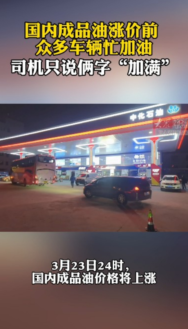 国内成品油价格即将上涨 加油站灯火通明司机忙加油大众新闻·大众日报 昨天22:04原创3月23日夜晚,在泰安市东岳大街,记者看到众多车辆在忙着加油。3月23日24时,国内成品油价格将上涨。(大众新闻记者 李培乐)