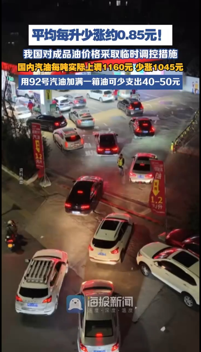 平均每升少涨约0.85元!国家发改委出台临时调控措施,为车主减负!受美以伊冲突影响,国际原油价格大幅飙升,根据现行价格机制计算,自3月23日24时起,国内汽、柴油(标准品)最高零售价格每吨分别应上调2205元、2120元,为减轻下游用户负担,国家对成品油价格采取临时调控措施,国内汽、柴油每吨实际上调1160元、1115元,少涨1045元、1005元,相当于全国平均汽、柴油每升少涨0.85元左右。对于私家车车主,按油箱50—60升测算,用92号汽油加满一箱油可少支出40—50元;对于大货车司机,按油箱400—600升测算,加满一箱油可少支出300到500元。