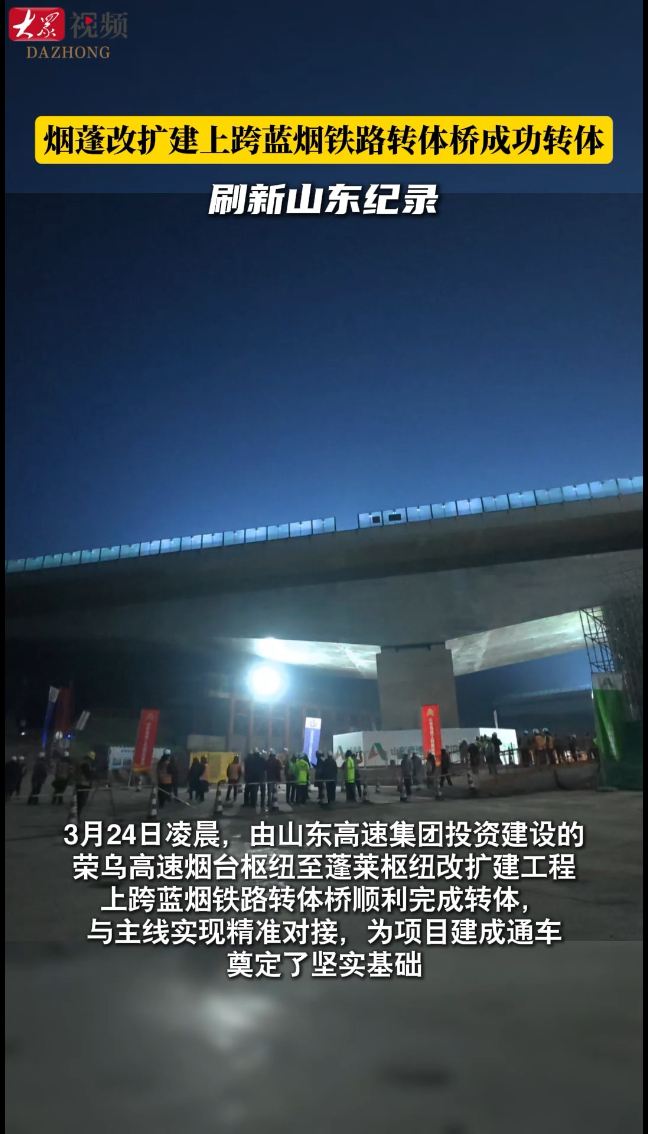 刷新山东纪录!荣乌高速烟蓬改扩建上跨蓝烟铁路转体桥成功转体大众新闻 | 15:51 原创大众新闻 微信扫码扫码下载客户端3月24日凌晨,由山东高速集团投资建设的荣乌高速烟台枢纽至蓬莱枢纽改扩建工程上跨蓝烟铁路转体桥顺利完成转体,与主线实现精准对接,为项目建成通车奠定了坚实基础。(大众新闻记者 范薇)