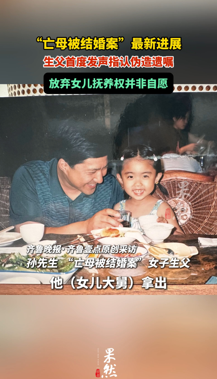 果然视频|“亡母被结婚案”女子生父首度发声,指认遗嘱伪造齐鲁晚报·齐鲁壹点客户端 16:23原创3月23日,河南鲁山“女子举报母亲去世后被伪造身份结婚、遗产遭侵占”案当事人的亲生父亲孙先生接受齐鲁晚报·齐鲁壹点采访,首度公开回应:当年签署放弃女儿抚养权协议并非出于自愿,并指认前妻赵某留下的遗嘱系伪造。