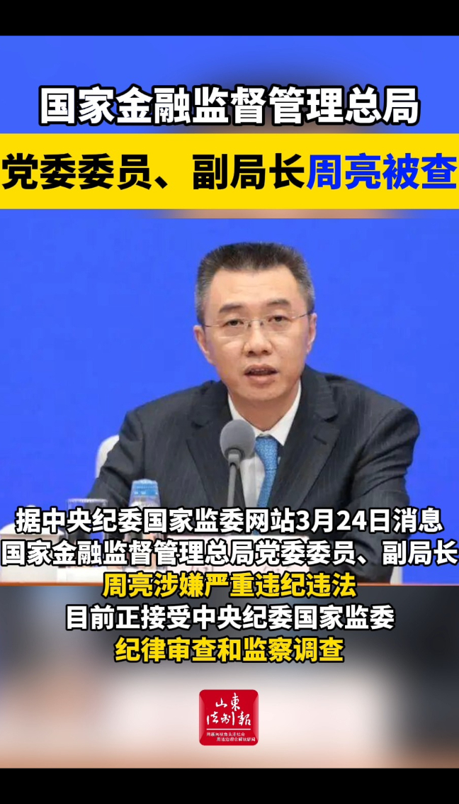 国家金融监督管理总局党委委员、副局长周亮被查 20:20 中央纪委国家监委网站 微信扫码扫码下载客户端据中央纪委国家监委网站3月24日消息,国家金融监督管理总局党委委员、副局长周亮涉嫌严重违纪违法,目前正接受中央纪委国家监委纪律审查和监察调查。