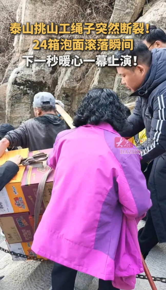 泰山挑山工绳子突然断裂!24箱泡面滚落瞬间,下一秒暖心一幕上演!