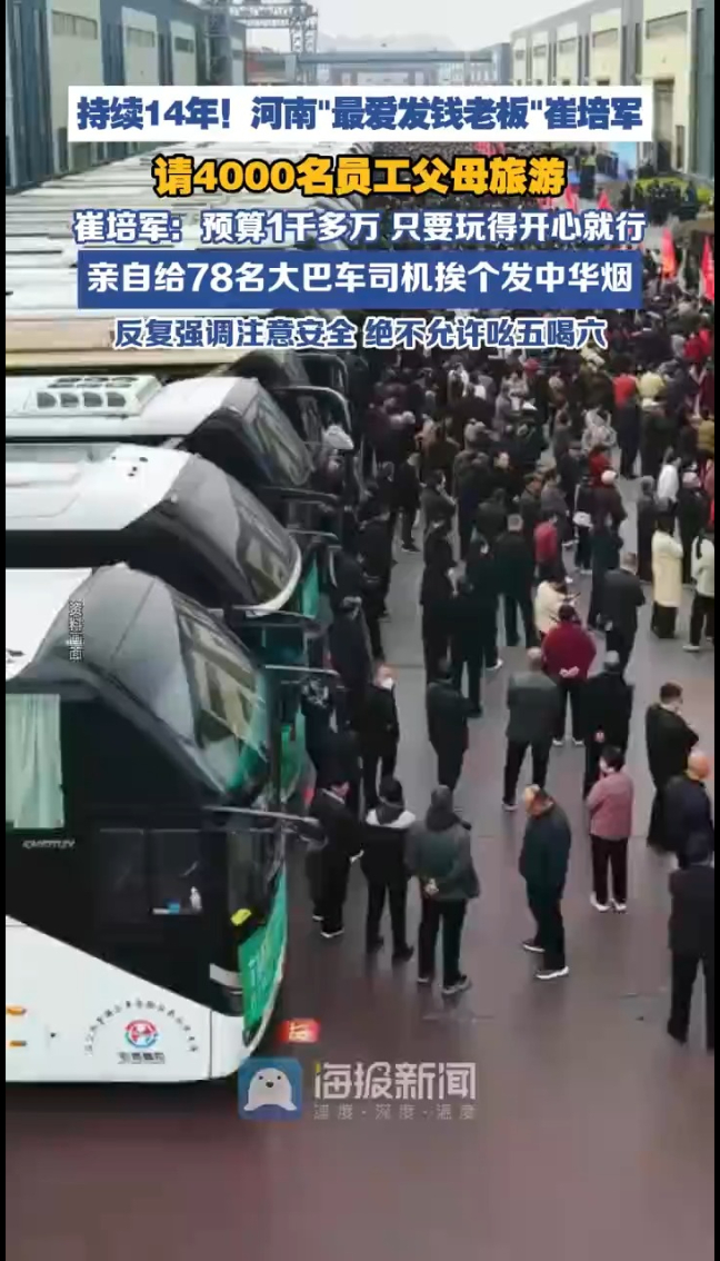 “全网最爱发钱的老板”崔培军请4000多名员工父母免费旅游!预算一千多万元,全部费用由老板买单,只希望他们玩得开心!3月24日,河南矿山第十四届孝文化感恩旅游节正式启动,现场4000余名员工父母有序登车,开启为期6天的徐州、南京、苏州、无锡江南免费之旅。该活动已连续举办了14年。