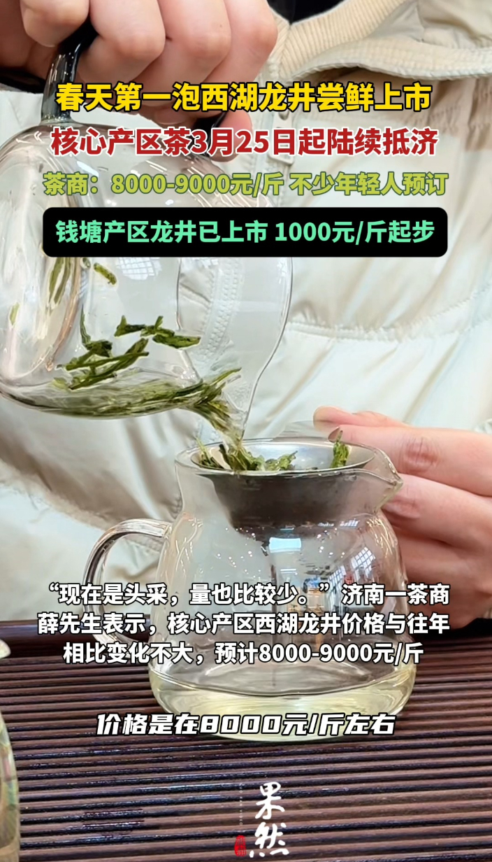果然视频|西湖龙井春茶陆续在济上市,不少茶客等着这口“鲜”齐鲁晚报·齐鲁壹点客户端 11:27原创3月24日,记者在济南第一茶市了解到,预计首批西湖龙井将于3月25日到达济南。济南一茶商薛先生表示,核心产区西湖龙井价格与往年相比变化不大,预计8000-9000元/斤。记者了解到,目前济南市场在售龙井茶以浙江钱塘产区的龙井为主,开采时间早,种植规模较大。根据品质不同,价格1000-3000元/斤不等,随着产量增加,价格预计会有所下探。(齐鲁晚报·齐鲁壹点记者 管悦 寇文奇)