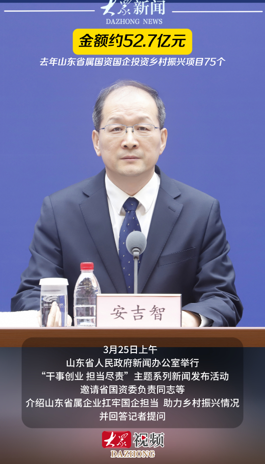 金额约52.7亿元,去年山东省属国资国企投资乡村振兴项目75个大众新闻 12:25原创3月25日上午,山东省人民政府新闻办公室举行“干事创业 担当尽责”主题系列新闻发布活动,邀请省国资委负责同志等介绍山东省属企业扛牢国企担当,助力乡村振兴情况,并回答记者提问。(大众新闻记者 高广超 姜倩 策划 马玉峰 王雅洁)