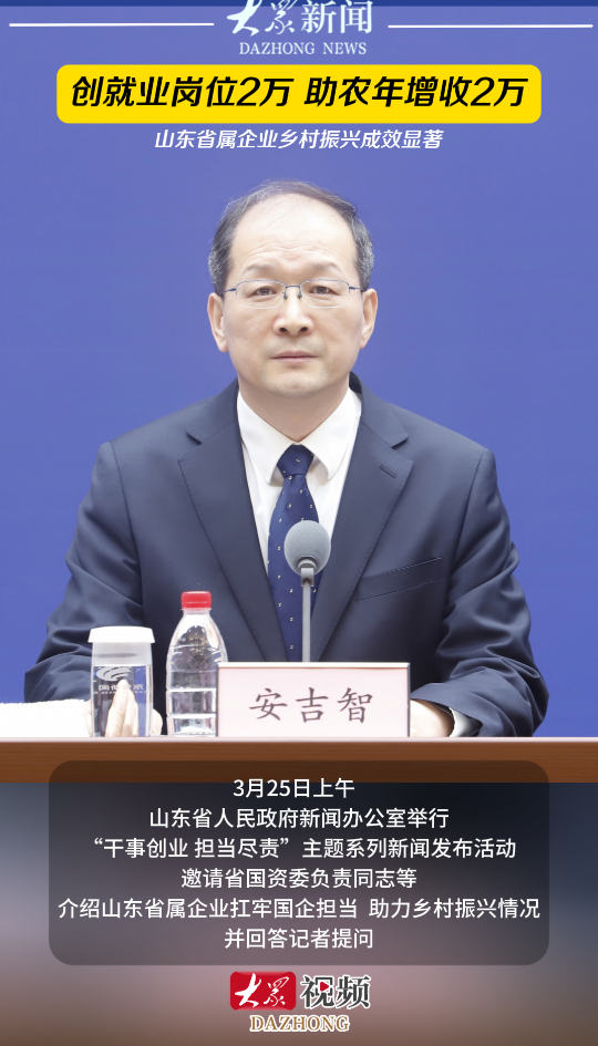 创就业岗位2万、助农年增收2万,山东省属企业乡村振兴成效显著大众新闻 12:25原创3月25日上午,山东省人民政府新闻办公室举行“干事创业 担当尽责”主题系列新闻发布活动,邀请省国资委负责同志等介绍山东省属企业扛牢国企担当,助力乡村振兴情况,并回答记者提问。(大众新闻记者 高广超 姜倩 策划 马玉峰 王雅洁)