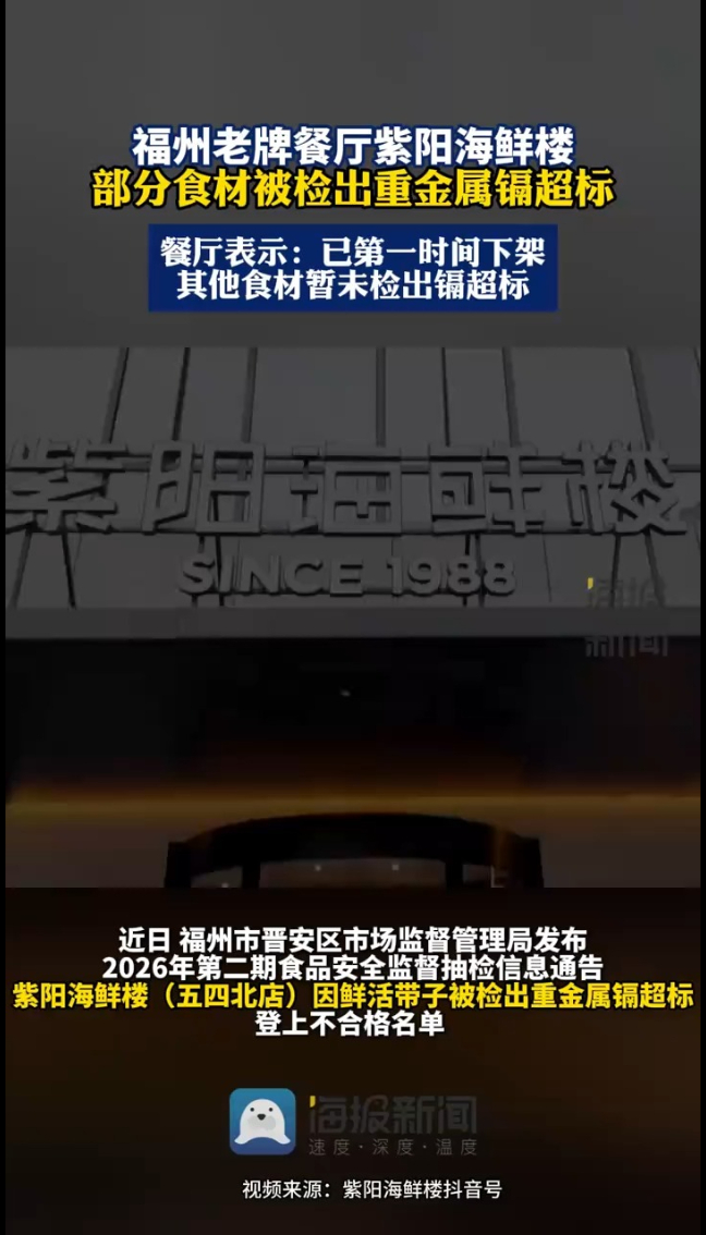 福州“紫阳海鲜楼”部分食材被检出重金属镉超标 餐厅:食材已下架