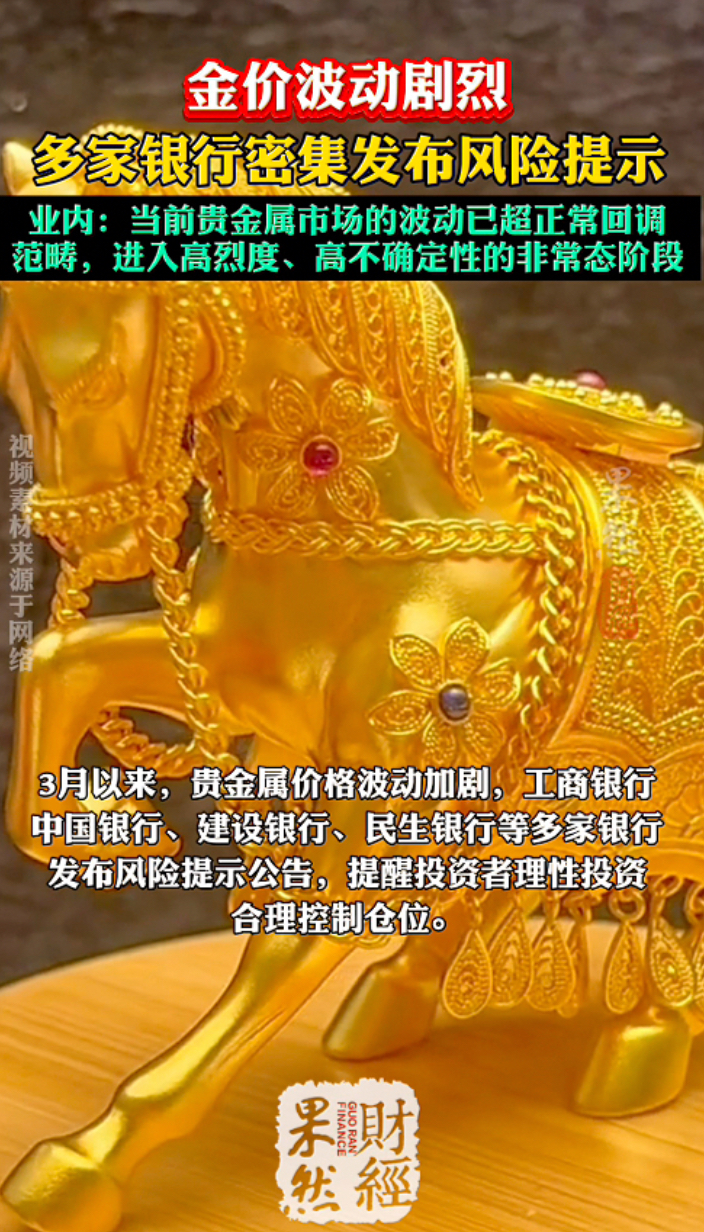 果然财经|金价波动剧烈,多家银行密集发布风险提示齐鲁壹点 | 17:29 原创齐鲁晚报·齐鲁壹点客户端 微信扫码扫码下载客户端3月以来,贵金属价格波动加剧,工商银行、中国银行、建设银行、民生银行等多家银行发布风险提示公告,提醒投资者理性投资、合理控制仓位。据环球网财经,各家银行在公告中普遍强调,近期影响市场不稳定的因素较多,贵金属市场波动剧烈,建议投资者基于自身财务状况和风险承受能力开展理性投资。