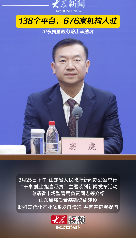 138个平台、676家机构入驻,山东质量服务跑出加速度大众新闻 18:29原创3月25日下午,山东省人民政府新闻办公室举行“干事创业 担当尽责”主题系列新闻发布活动,邀请省市场监管局负责同志等介绍山东加强质量基础设施建设,助推现代化产业体系发展情况,并回答记者提问。(大众新闻记者 高广超 程文琪 策划 马玉峰 王雅洁)