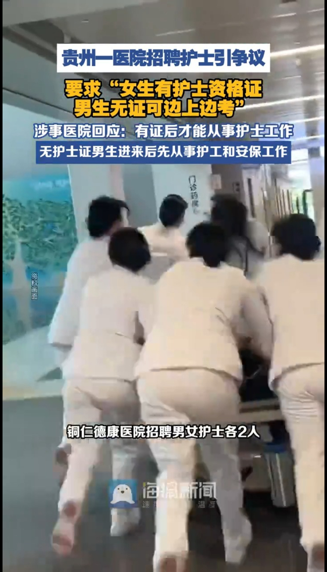 主播说| 女生必须有证,男生就可以无证先上岗?贵州一医院招聘护士引争议