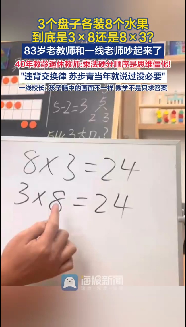 主播说|3个盘子各装8个水果到底是3×8还是8×3?83岁老教师和一线老师吵起来了