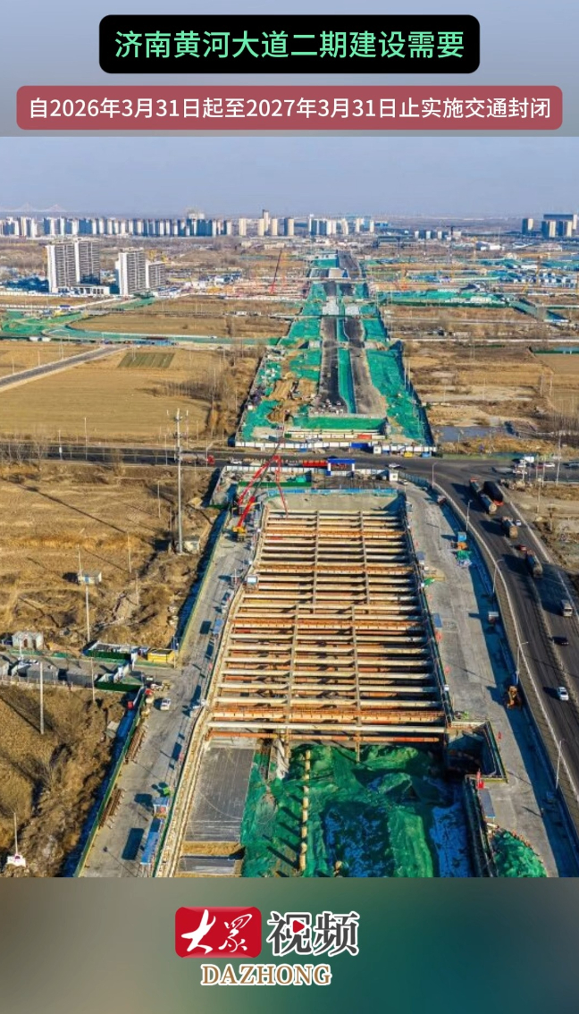 济南黄河大道二期建设工程东起济乐高速,西至水厂西路,全长约8.2公里。因黄河大道二期施工需要,为确保道路安全、有序,根据《山东省实施<中华人民共和国道路交通安全法>办法》第41条规定, 自2026年3月31日起至2027年3月31日止实施交通封闭。施工期间,驻区车辆经便道通行,过境车辆请绕行外围相关道路。