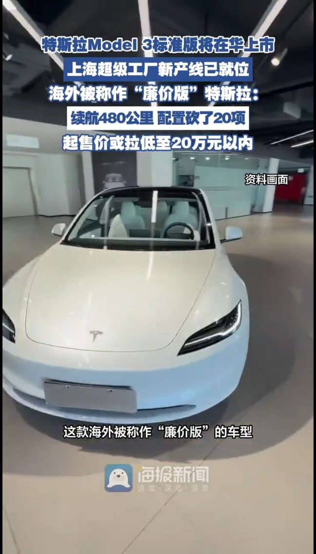 3月25日消息,这款海外被称作“廉价版”的车型,上海超级工厂已建成专属产线,上市筹备全部就绪。该车型已纳入工信部免税目录,搭载52.9kWh电池,CLTC工况续航480公里,比现款23.55万的后驱版少154公里。配置上也做了精简,比如座椅换成织物的、取消通风和氛围灯,后排娱乐屏也没了,车窗改成单层玻璃,音响喇叭也减少了。百公里加速慢了约1秒,但门槛大幅拉低,海外起售价约25.5万人民币,此次国产定价下探,将进一步覆盖主流消费市场。