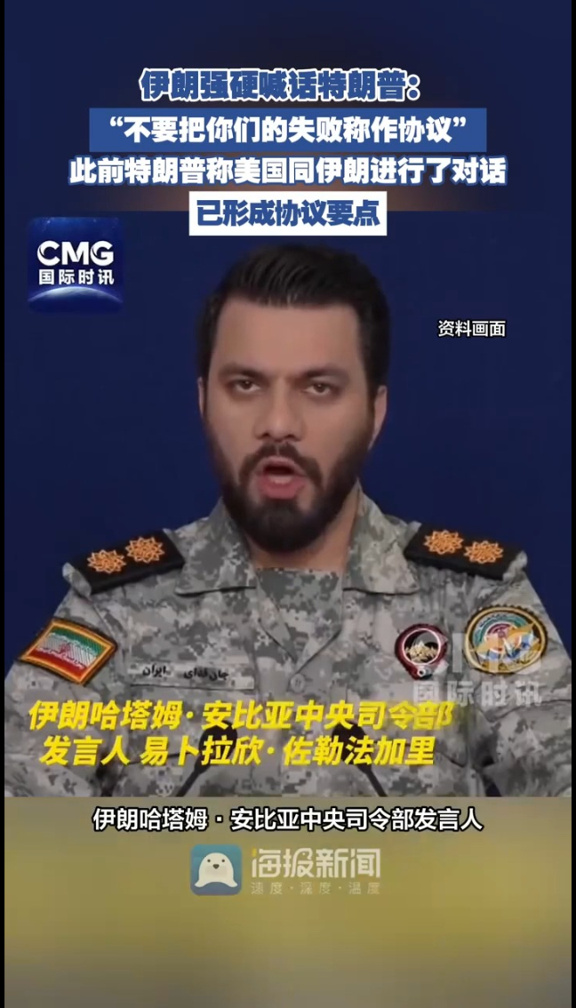 伊朗强硬喊话特朗普:“不要把你们的失败称作协议。”当地时间25日,伊朗哈塔姆·安比亚中央司令部发言人就美国总统特朗普“与伊朗正在进行谈判”的说法再次予以否认。