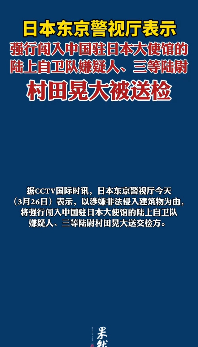 日本东京警视厅表示,以涉嫌非法侵入建筑物为由,将强行闯入中国驻日本大使馆的陆上自卫队嫌疑人、三等陆尉村田晃大送交检方。
