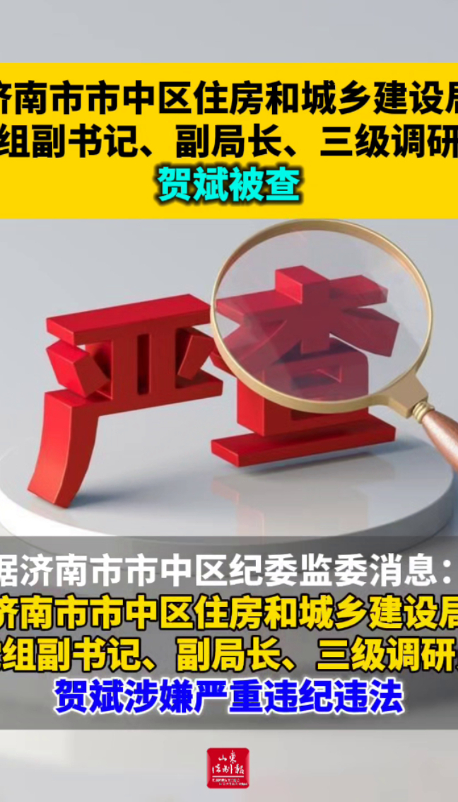 济南市市中区住房和城乡建设局党组副书记、副局长、三级调研员贺斌被查 18:44 大众新闻·山东法制报 微信扫码扫码下载客户端据济南市市中区纪委监委消息:济南市市中区住房和城乡建设局党组副书记、副局长、三级调研员贺斌涉嫌严重违纪违法,目前正接受济南市市中区纪委监委纪律审查和监察调查。