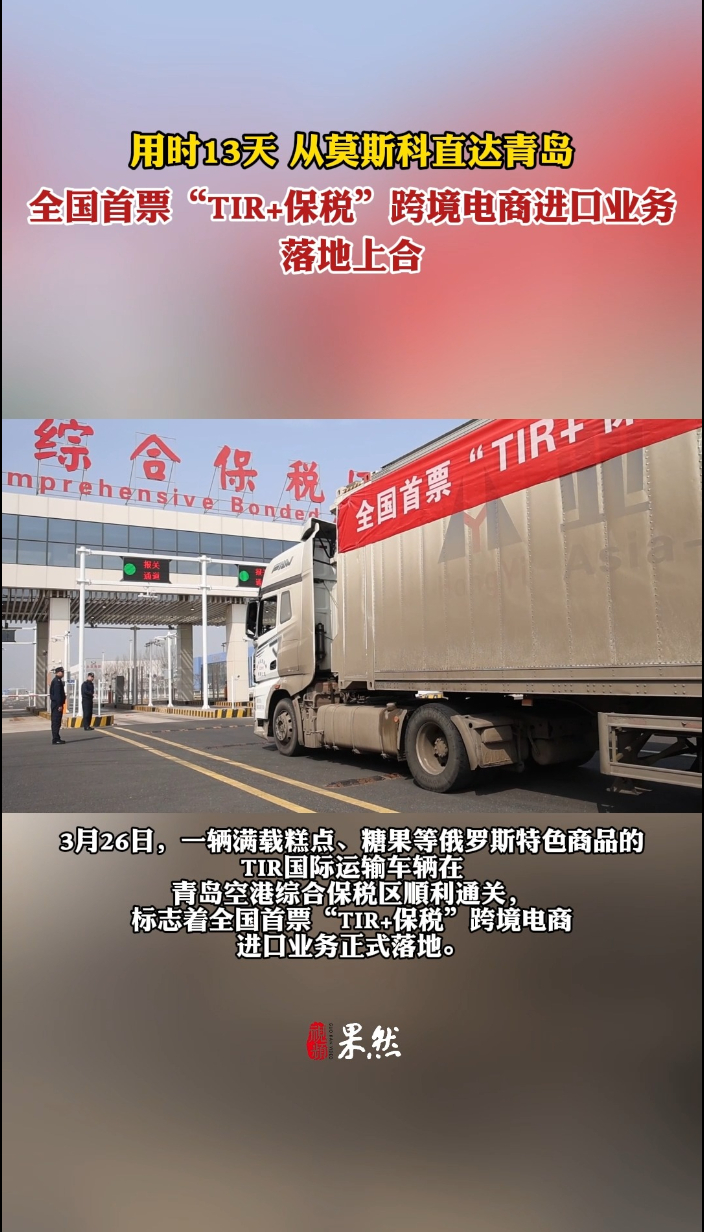 果然视频丨全国首票“TIR+保税”跨境电商进口业务落地齐鲁晚报·齐鲁壹点客户端 20:58原创3月26日,一辆满载糕点、糖果俄罗斯特色商品的TIR国际运输车辆在青岛空港综合保税区顺利通关,标志着全国首票“TIR+保税”跨境电商进口业务正式落地,该批货物于3月13日从上合示范区“丝路电商”综服基地俄罗斯运营中心(莫斯科)启运,经满洲里口岸入境后,全程公路直达青岛空港综合保税区,实现“一次申报、一路畅通”。 (齐鲁晚报·齐鲁壹点 刘震 通讯员 张航)