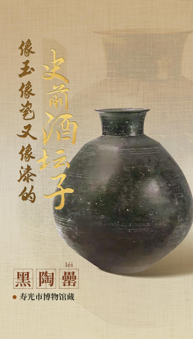 一个黑黝黝的酒坛子,乍一看黑得发亮,再一看好像有玉的光华,又好像瓷器般坚硬,又仿佛带着漆器的乌泽,它究竟有何玄机?在寿光市博物馆,有这样一件镇馆之宝,它被摆在展厅显眼位置,黑得深沉、亮得耀眼,自带庄重典雅的气质,它就是龙山文化时期的黑陶罍。它属于龙山文化中晚期,高31.4厘米、口径11厘米,卷沿、小口、口微侈,高颈、折肩,最大腹径偏于下部,小平底;陶质细腻、器壁厚薄均匀,圆润饱满、古朴优美。海岱地区的龙山文化遗址中,很多都发现过黑陶罍,但多多少少有修补拼接的痕迹,寿光市博物馆的这件黑陶罍却完整无缺,在制作工艺、造型、陶质等方面堪称完美。