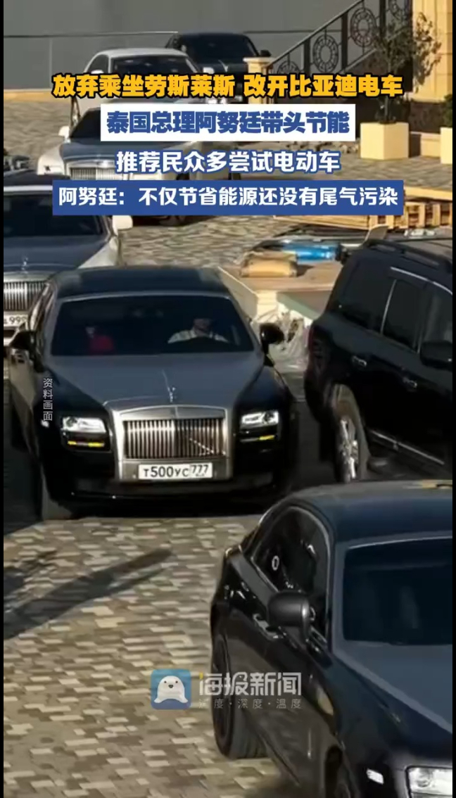 主播说|放弃乘坐劳斯莱斯,改开比亚迪电车,泰国总理阿努廷带头节能海报新闻 | 11:53 原创大众新闻·海报新闻 微信扫码扫码下载客户端 放弃乘坐劳斯莱斯 改开比亚迪电动车!泰国总理阿努廷推荐民众多尝试电动车! 受中东局势影响国际油价持续上涨,3月25日,阿努廷被拍到乘坐一辆比亚迪品牌电动车前往政府大楼办公,以此作为应对能源价格上涨的示范举措。 阿努廷称推荐民众多尝试电动车,直言电动车既能节省能源,又不会产生尾气污染。 (海报新闻综合看看新闻 编辑李易展 李硕琳 刘泽)