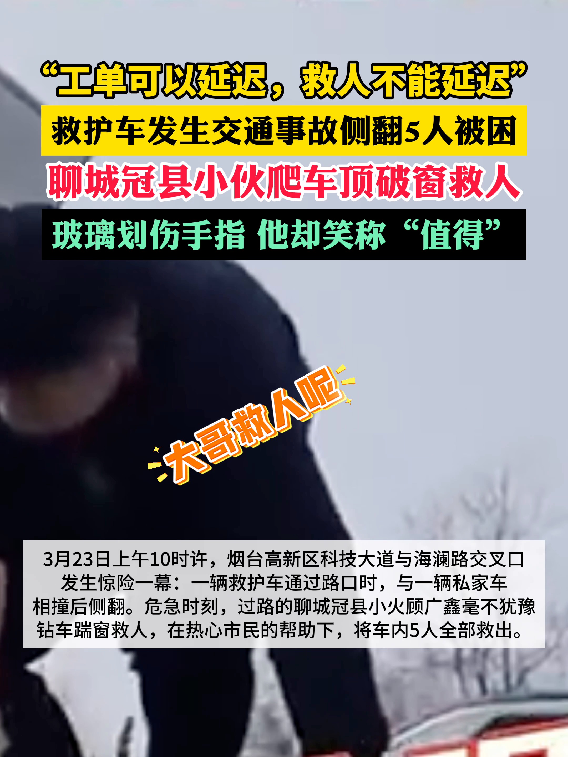 “工单可以延迟,救人不能延迟!”冠县小伙爬车顶破窗救人大众新闻客户端 12:44原创3月23日上午10时许,烟台高新区科技大道与海澜路交叉口发生惊险一幕:一辆救护车通过路口时,与一辆私家车相撞后侧翻。危急时刻,过路的聊城冠县小伙顾广鑫毫不犹豫钻车踹窗救人,在热心市民的帮助下,将车内5人全部救出。