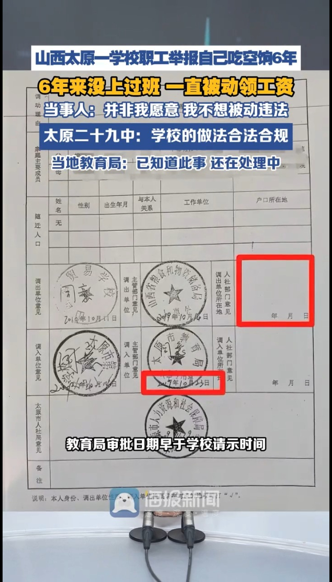 山西太原一学校职工举报自己吃空饷6年:6年来没上过班 一直被动领工资。据柳先生介绍,他2019年底从原校调入太原市第二十九中学,仅上了一个月班就发现调动手续存在多处违规。人社部门盖章空白,教育局审批日期早于学校请示时间,岗位职级也被登记错误。