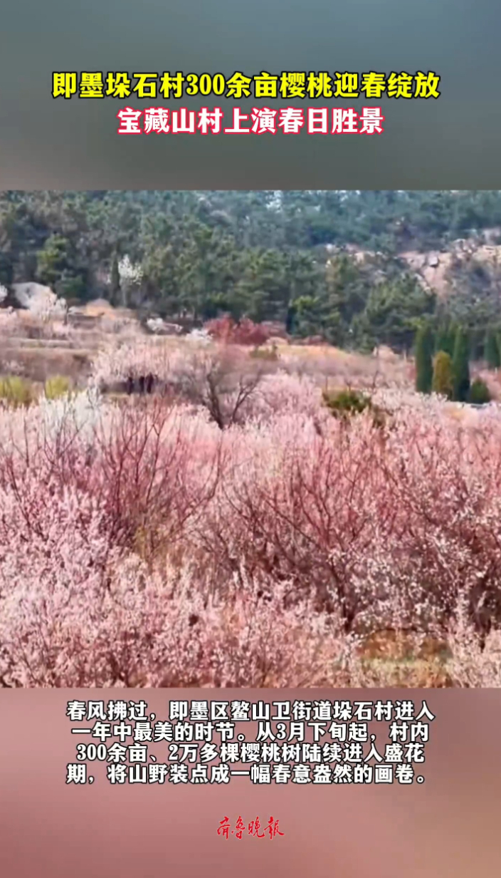 果然视频丨即墨垛石村300多亩樱桃迎春绽放齐鲁晚报·齐鲁壹点客户端 15:40原创春风拂过,青岛市即墨区鳌山卫街道垛石村进入一年中最美的时节。从3月下旬起,村内300余亩、2万多棵樱桃树陆续进入盛花期,将山野装点成一幅春意盎然的画卷。 (齐鲁晚报·齐鲁壹点 宋祖锋)