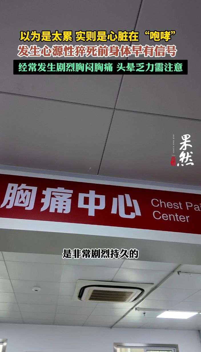果然视频丨猝死前身体有信号!经常剧烈胸闷胸痛、头晕乏力需注意齐鲁晚报·齐鲁壹点客户端 15:33原创心源性猝死发生并非毫无征兆,身体早已发出预警信号。青岛大学附属医院胸痛中心医疗总监李鹏称,经常发生剧烈持久且难以忍受的胸闷胸痛,出现头晕、心慌、大汗等不适的人群需要引起注意。 (齐鲁晚报·齐鲁壹点 曹婧雯)