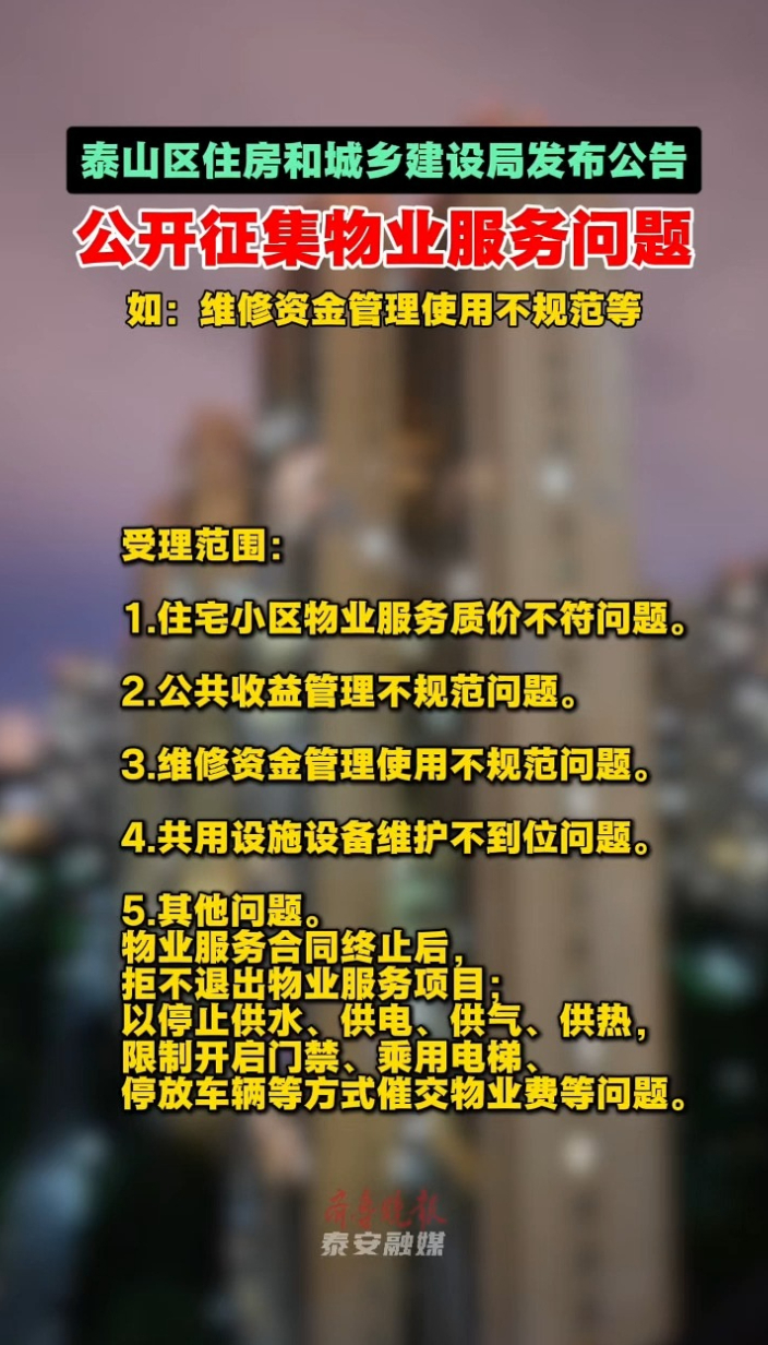 泰山区住建局发布公开征集物业服务问题线索公告。