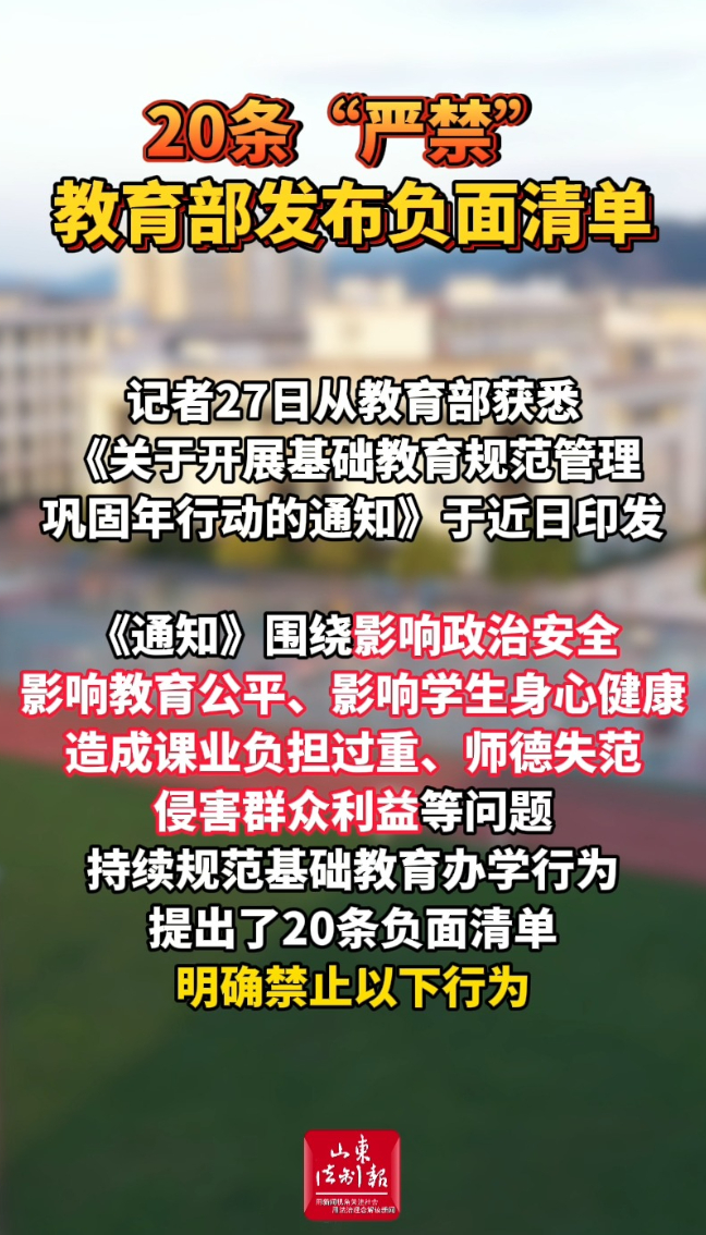《通知》围绕影响政治安全、影响教育公平、影响学生身心健康、造成课业负担过重、师德失范、侵害群众利益等问题,持续规范基础教育办学行为,提出了20条负面清单,明确禁止以下行为: