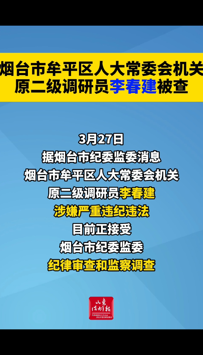 烟台市牟平区人大常委会机关原二级调研员李春建被查山东法制报 | 18:02 山东省纪委监委网站 微信扫码扫码下载客户端3月27日,据烟台市纪委监委消息:烟台市牟平区人大常委会机关原二级调研员李春建涉嫌严重违纪违法,目前正接受烟台市纪委监委纪律审查和监察调查。